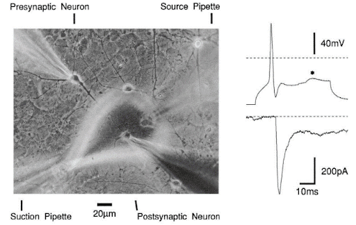 Електрофізіологічні дослідження синаптичної передачі методом парної реєстрації (pair-recording) одночасно в двох синаптично зв’язаних нейронах шляхом стимуляції соми пресинаптичного нейрону та одночасної реєстрації постсинаптичних струмів другого нейрону (Pfrieger, Veselovsky et al, 1992).